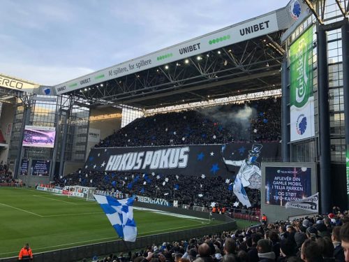 Viel verpasst wurde also nicht. Einigermaßen ausgeschlafen und ein Frühstück später kam ich etwa 1 bis 1,5 Stunden vor Anpfiff am Stadion an. Der Einlass war, wie erwartet, unkompliziert und ging angenehm schnell. Die Plätze waren okay, links neben der „Sektion 12“ – der Tribüne der Ultras vom FC Kopenhagen. Die Sicht war etwas eingeschränkt durch die Beton-Tribünen-Begrenzung. Abzüge in der B-Note. Beide Fanlager hatten eine Choreo vorbereitet. Die von Brøndby war etwas schlichter gehalten. Die vom FC Kopenhagen hingegen war eine reine 10/10. Unter dem Motto „Hokus Pokus… København i fokus“ wurde eine zweiteilige Choreo präsentiert und zeitgleich diverse Fackeln und Römische Lichter gezündet. Absolutes Highlight war die Inszenierung, bei der sich jemand in ein weißes Zauberer-Outfit samt Zylinder umgezogen hatte und so auf dem Vorsänger-Podest stand, um die ersten Römischen Lichter zu zünden.
