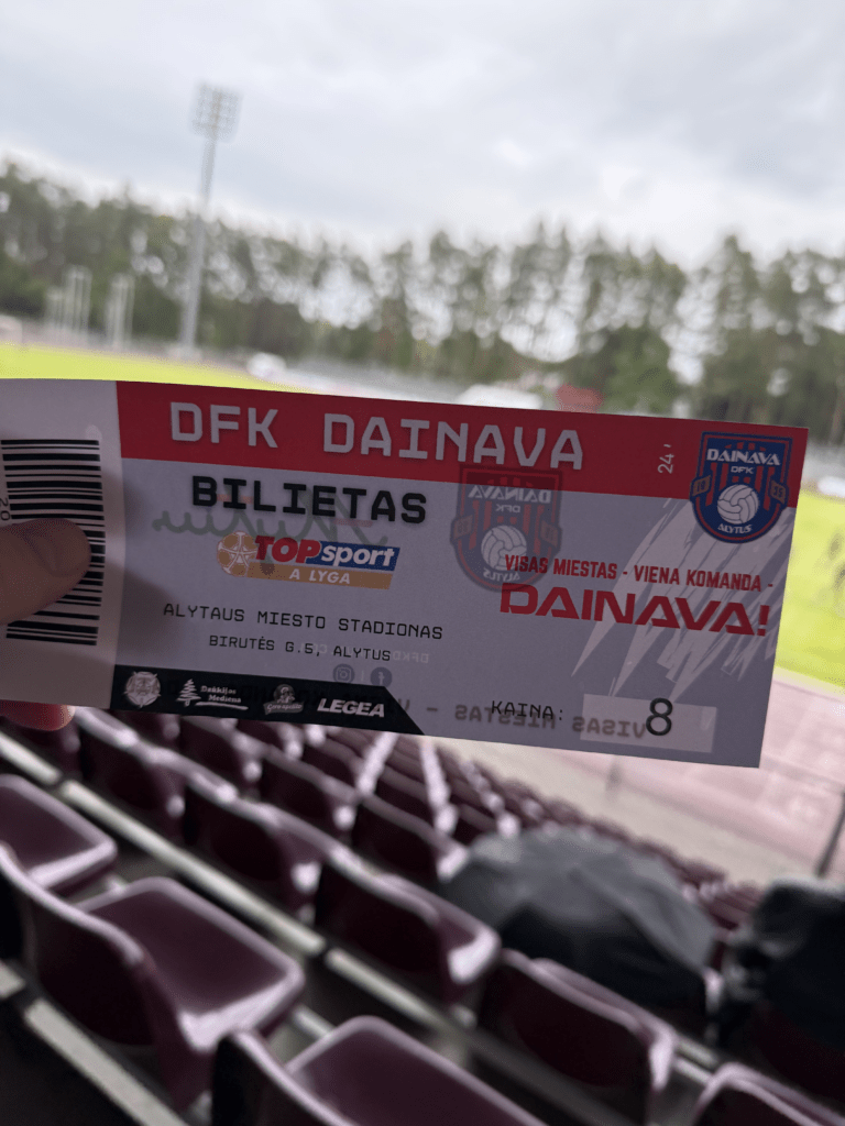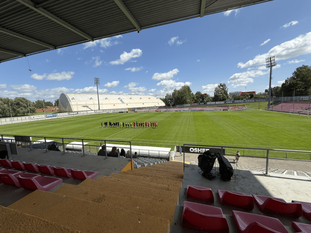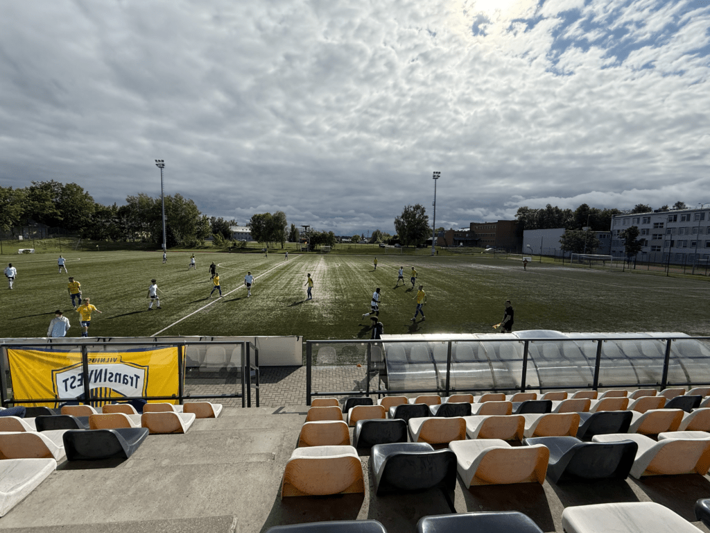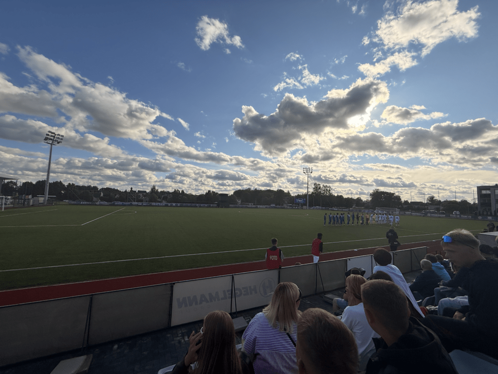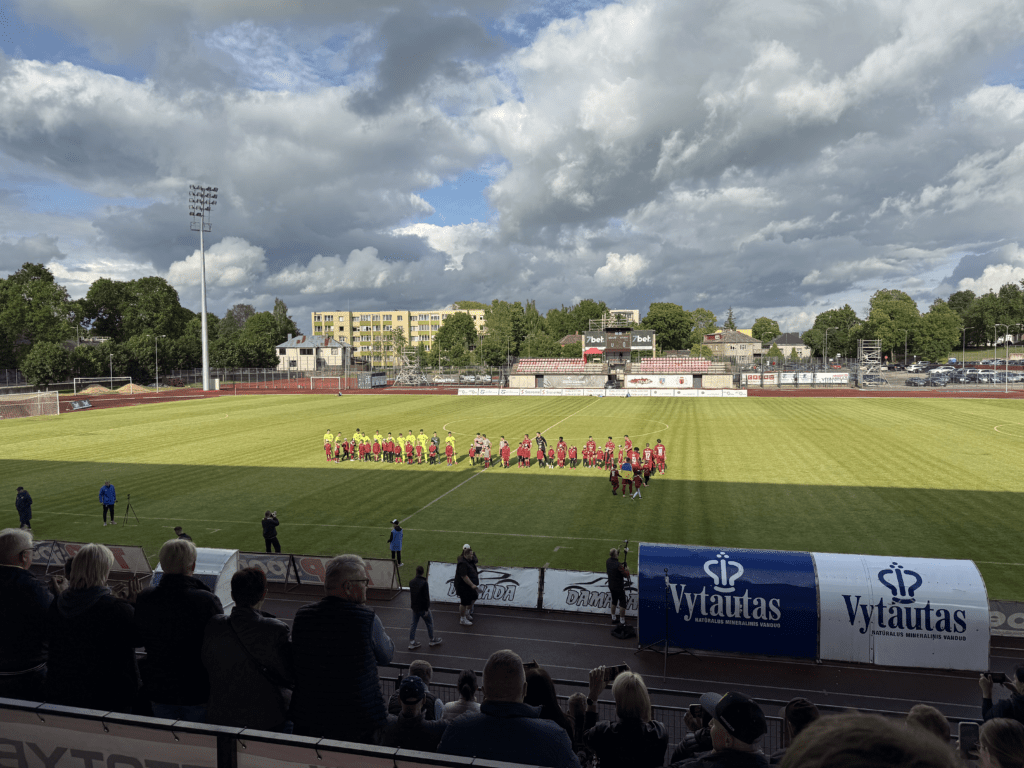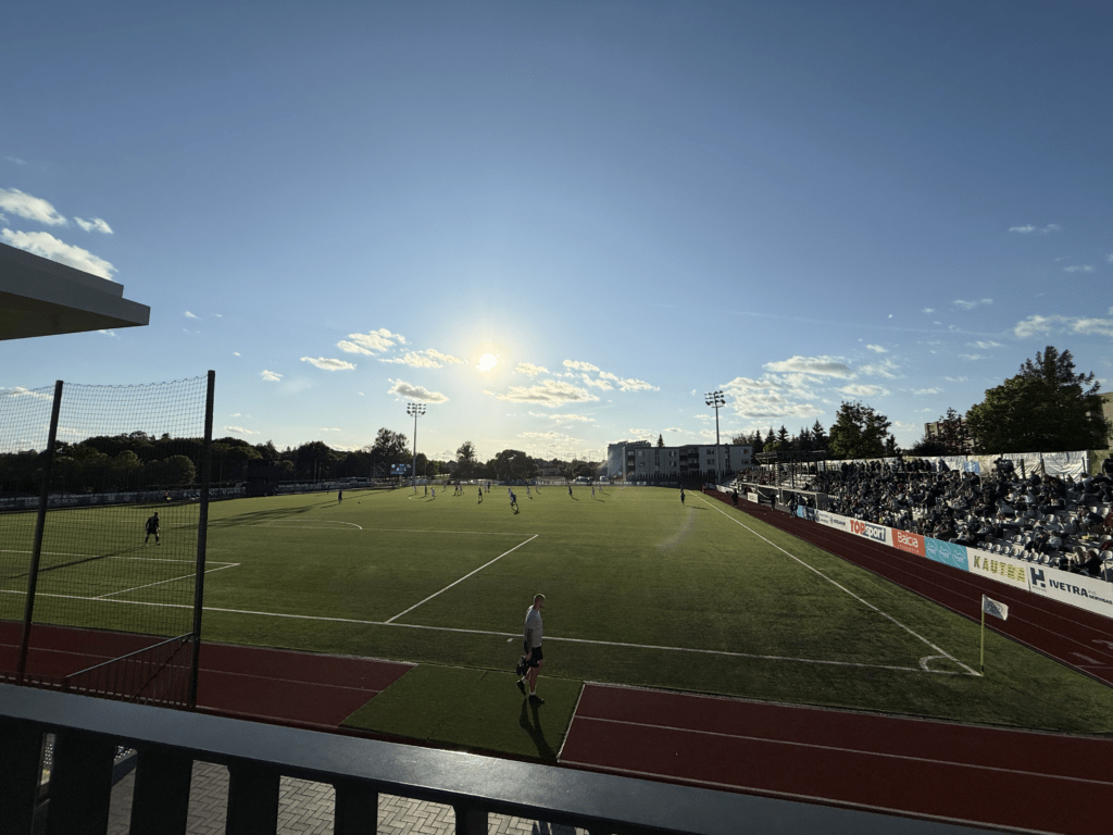 Es war endlich soweit. An einem warmen, sonnigen Montagabend, dem letzten Tag im Juni und damit auch dem Abschluss der Saison 2024/2025, sollte es geschehen: Die A Lyga, Litauens höchste Spielklasse, sollte komplettiert werden. Das Stadion, ein moderner Neubau, liegt etwa 45 bis 60 Minuten außerhalb von Kaunas. Den alten Spielort des FC Hegelmann hatte ich bereits 2023 bei meinem letzten richtigen Besuch in Litauen gesehen. Nun stand hier also der finale Spieltag an. Es war nett, dass es zu diesem Anlass sogar eine Halbzeitshow gab ( 😉 ). Dank kostenfreiem Eintritt – auf Nachfrage erfährt man, dass das hier üblich ist – fanden sich immerhin rund 700 Zuschauer ein. Die Stimmung war, wie erwartet, eher zurückhaltend. Die Gäste aus Suduva waren gut vertreten, ebenso wie etwa 15 deutsche Hopper, die an diesem Montag scheinbar nichts Besseres vorhatten.