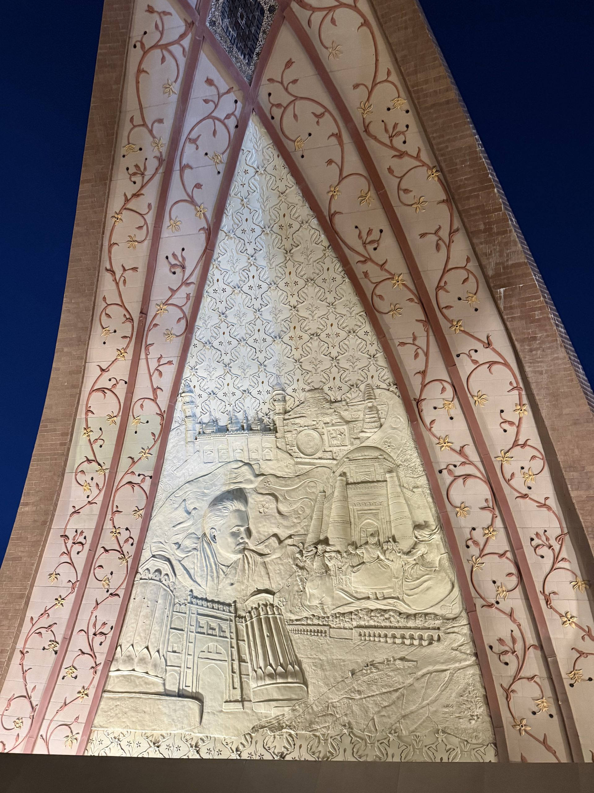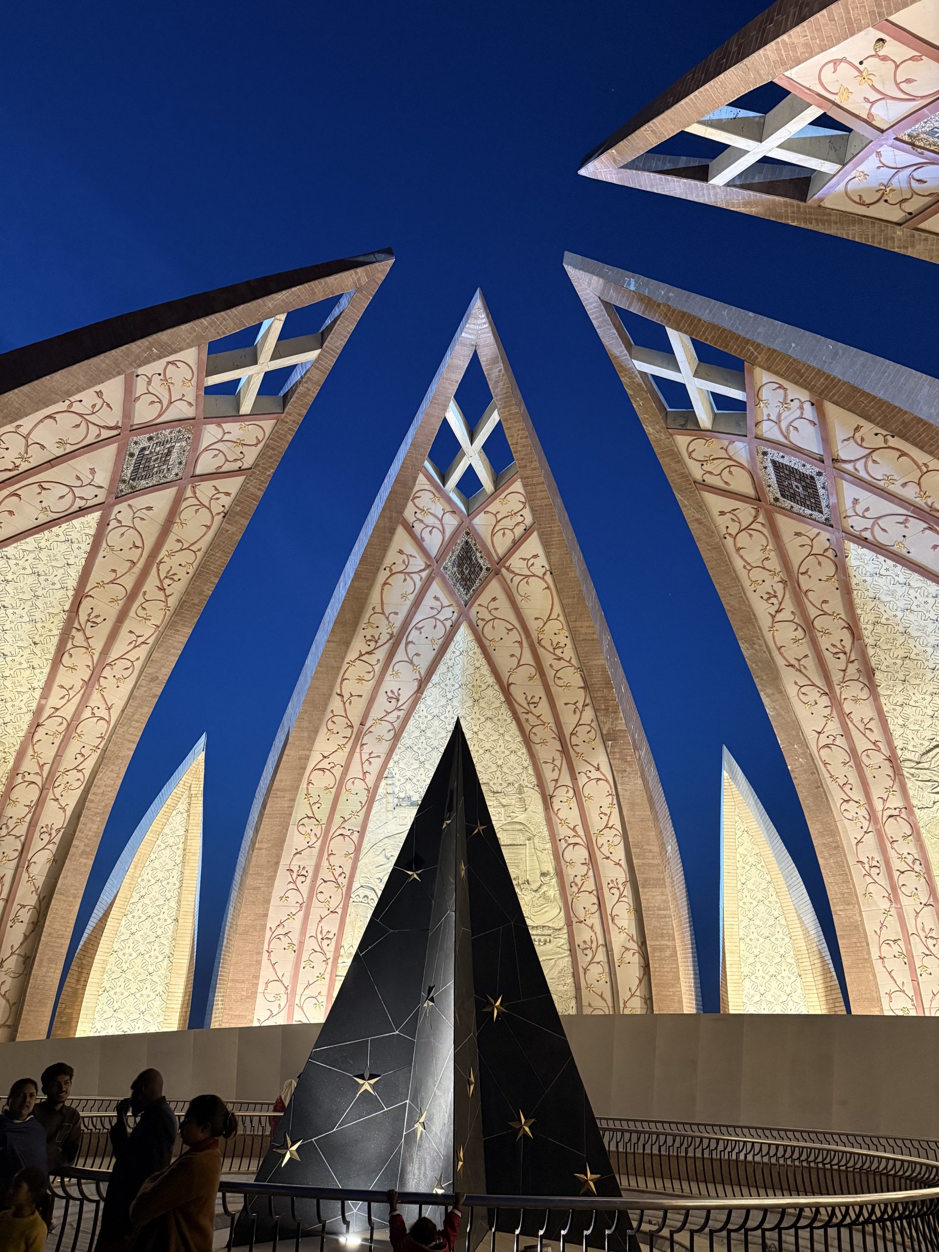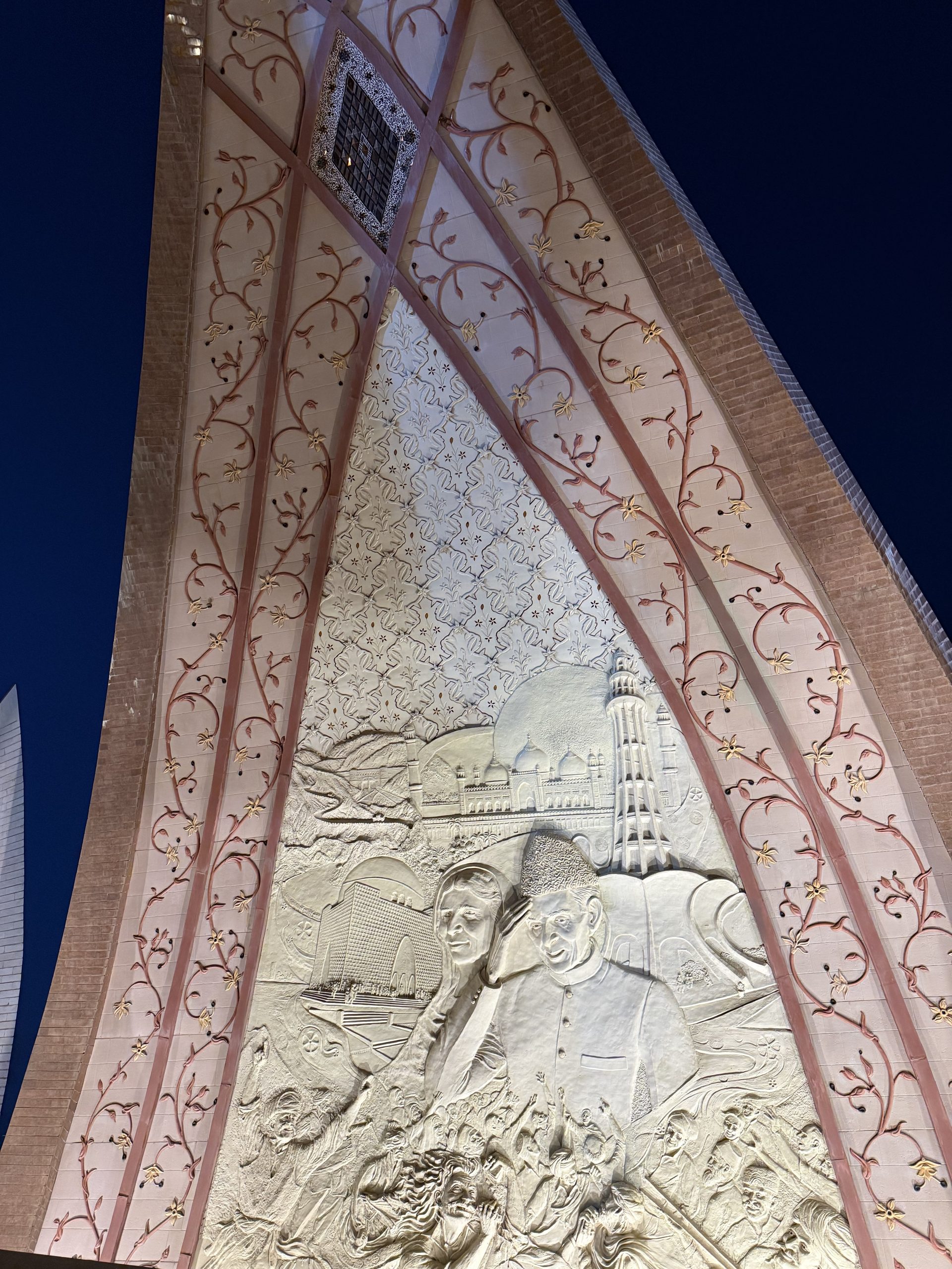Nach dem View-Point ging es für wenige Rupien den Berg runter zum Pakistan Monument. Während wir auf einen Fahrer gewartet haben, der unser Angebot int der App von InDrive annimmt (man schlägt der selber einen Preis vor, die Fahrer schauen sich das an, können annehmen oder Gegenangebote machen. Eigentlich ein cooles Prinzip) sprach uns eine weitere weiße Person an. Erst auf Englisch, dann aber auf deutsch. Vielleicht hast Du schon mal von einem deutschen Ort in Brasilien namens Blumenau gehört? Da kommt er her. Dolmetscher und spricht 6 Sprachen. Deutsch wohlgemerkt akzentfrei, da er immer mit seinen Großeltern gesprochen hat. Seine Eltern können gar kein deutsch, wie mittlerweile 99% der dortigen Generation. Mit dem haben wir uns dann das Taxi zum Monument geteilt und eben dieses noch besichtigt.