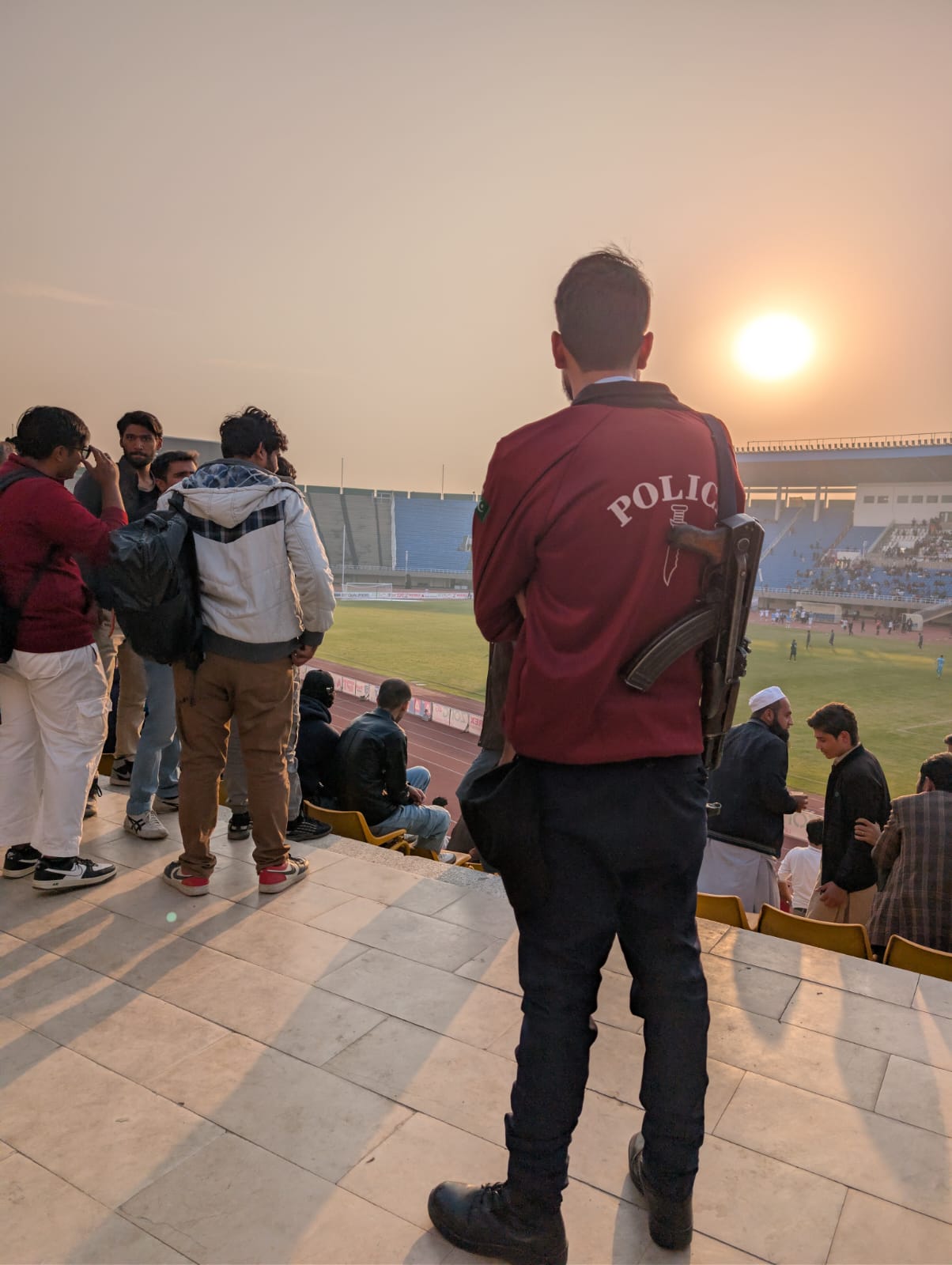Nach dem Fußball Länderpunkt hin, natürlich auch ohne Ticket, da auch hier ein Pakistanischer Pass die Bedingung gewesen wäre. Aber auch hier waren wir uns sehr sicher, dass wir schon irgendwie reinkommen. Vor Ort dann ein wahnsinniger Aufwand für Sicherheit. Sowas habe ich noch nie gesehen. Nicht mal am Flughafen.